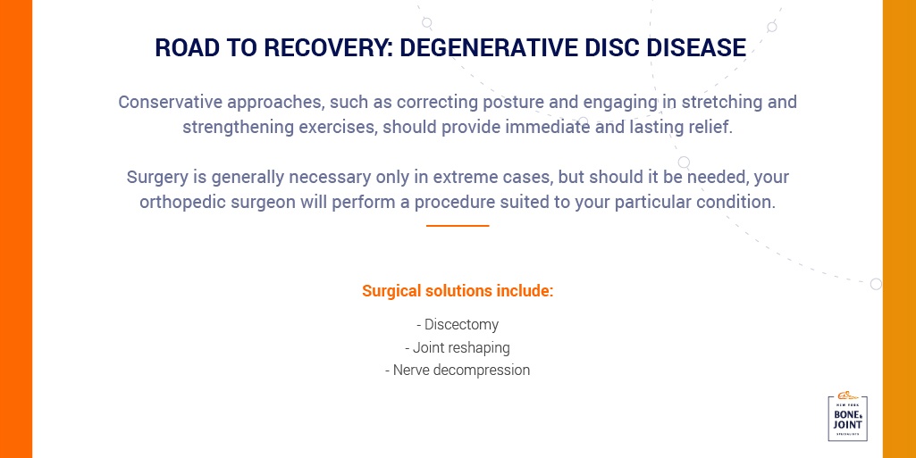 Degenerative disc disease rarely requires surgical intervention, but in more severe cases, surgery can restore stability to the spine. Should it be necessary, your doctor will refer you to a top spine surgeon, who can perform a procedure tailored to your condition: most commonly, they would either perform a discectomy (removing the damaged disc), joint reshaping, or nerve decompression in the spinal canal.