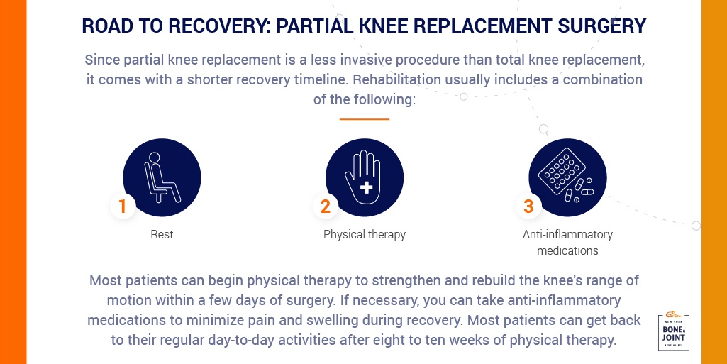 Because it’s a less invasive procedure than a total knee replacement, partial knee replacement comes with shorter recovery timelines and a reduced risk of surgical complications. While most patients need to remain in the hospital for several days after the procedure, you’ll be able to walk with few restrictions as soon as you’re discharged. Physical therapy can also begin within a few days of surgery.