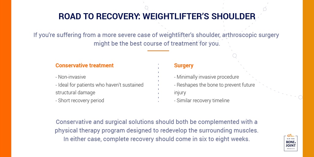 Distal clavicular osteolysis or AC joint osteolysis, often referred to as weightlifter’s shoulder, is an orthopedic condition characterized by a series of small fractures along the end of the collarbone. As its popular name suggests, it most commonly occurs in weightlifters, though heavy laborers are also susceptible to it, and in some cases it can be caused by direct trauma. As these fractures deteriorate, they increasingly erode the bones within the AC joint (the junction connecting the collarbone and the shoulder blade).